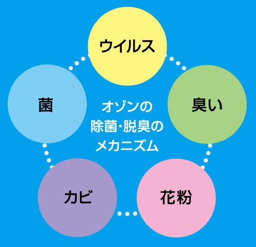オゾンの強力な酸化力で菌・ウイルスを抑制し、また、加齢臭やトイレなど、不快な臭い成分もオゾンにより抑制します。薬品を一切使用していないので、耐性菌が発生する心配もありません。安心安全な快適な空気環境を実現します。