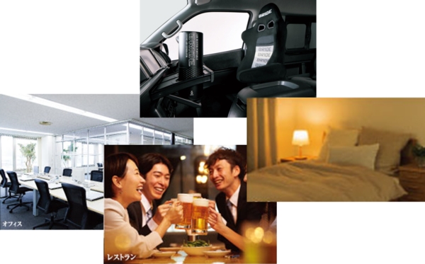 車内に限らず、リビングや玄関、トイレ、オフィス、旅行先のホテル、通勤の電車内、スポーツジム等、どこにでも持ち運びが可能です。また、薬品を一切使用していないので、保育園、医療・福祉・介護施設といった場所でも安心してお使いいただけます。