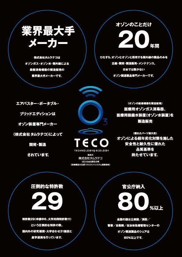 エアバスターは、オゾンガス、オゾン水、紫外線による殺菌消毒器機の業界最大手メーカー<株式会社タムラテコ>によって開発・製造されています。