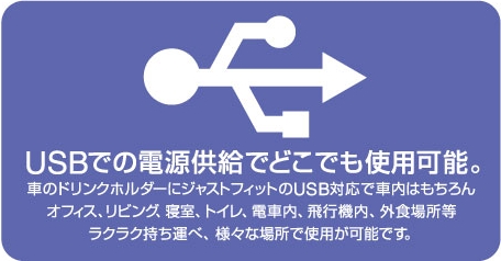 エアバスター・ポータブルBRIDEエディションは、クルマのドリンクホルダーにも収まる軽量コンパクトサイズで、入力電源もUSBによる供給のため、持ち運びにとても便利です。