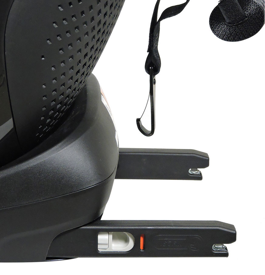 座席への取り付けは簡単・確実なISOFIXタイプ。チャイルドモードではISOFIXコネクターとトップテザーで取り付け。ハイバックモードでは、ISOFIXコネクターと車両側シートベルトを併用して取り付けします。