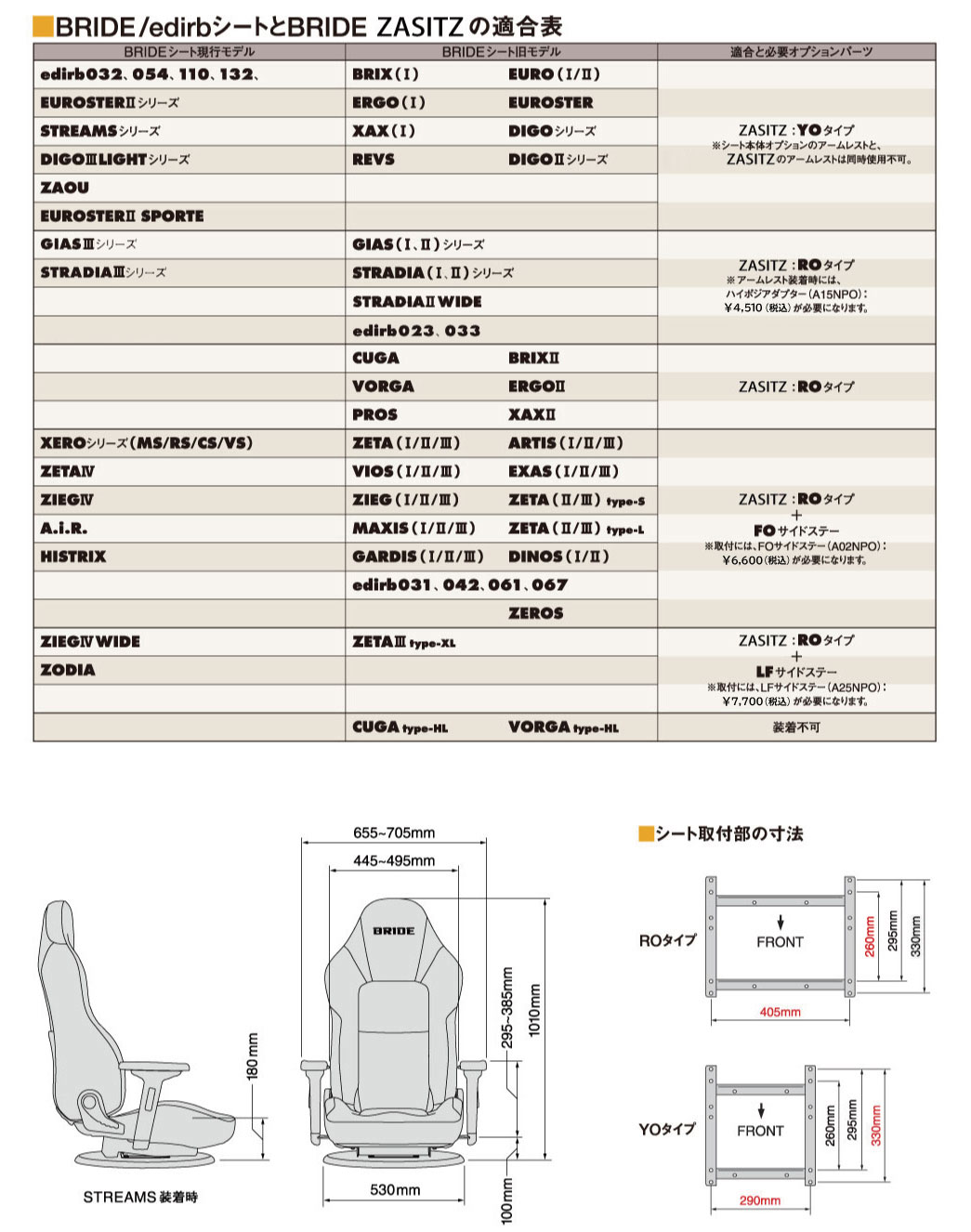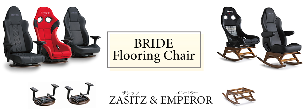 『 BRIDE Flooring Chair 』は『 Multi Caster PRO 』同様、BRDIEのスポーツシートをクルマだけではなく日々の生活の中で活用いただくためのアタッチメントチェアベースです。 『 Multi Caster PRO 』は日々の生活・仕事をより効率的、快適なものへと変化させ、『 BRIDE Flooring Chair 』は やすらぎ や くつろぎ といった癒しのある生活空間を作り出します。 和の空間に調和する回転式座椅子ベースの ZASITZ / ザシッツ と、快適で心地よい揺れをもつロッキングチェアベースの EMPEROR / エンペラー、この2タイプからそれぞれの生活スタイルにあったチェアベースをお選びいただけます。