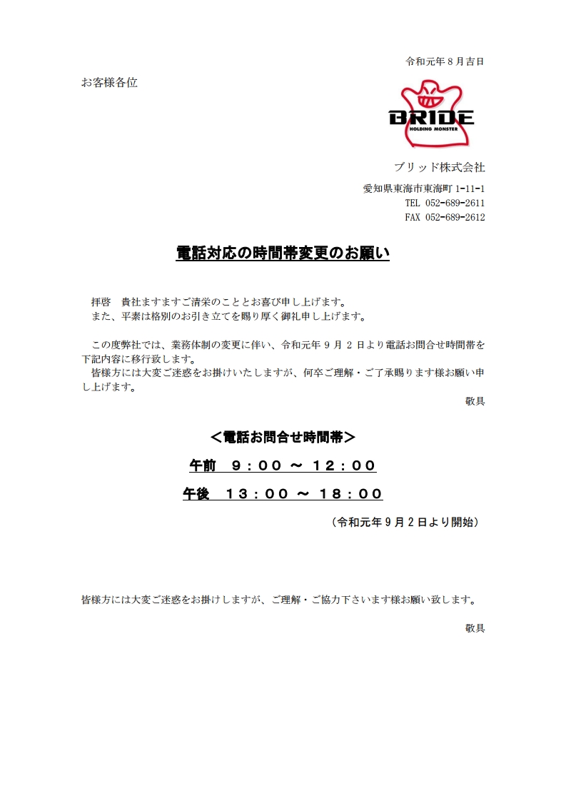 この度弊社では、業務体制の変更に伴い、令和元年 9 月 2 日より電話お問合せ時間帯を下記内容に移行致します。