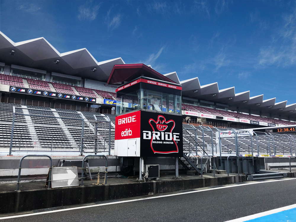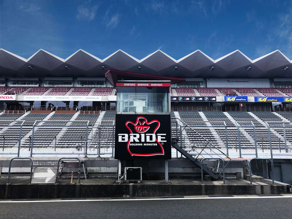 富士スピードウェイのレーシングコース、メインストレートにあるフラッグタワーには、大きなBRIDEのロゴマークが掲示されています。この度、この看板をリニューアルして、さらに目立つようになりました!