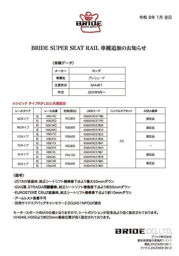 BRIDE SUPER SEAT RAIL 車種追加のお知らせ