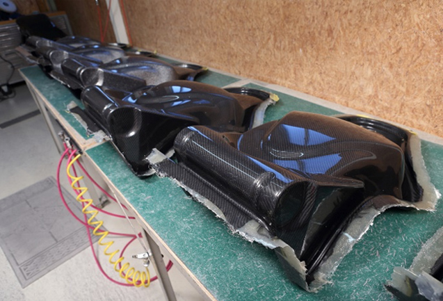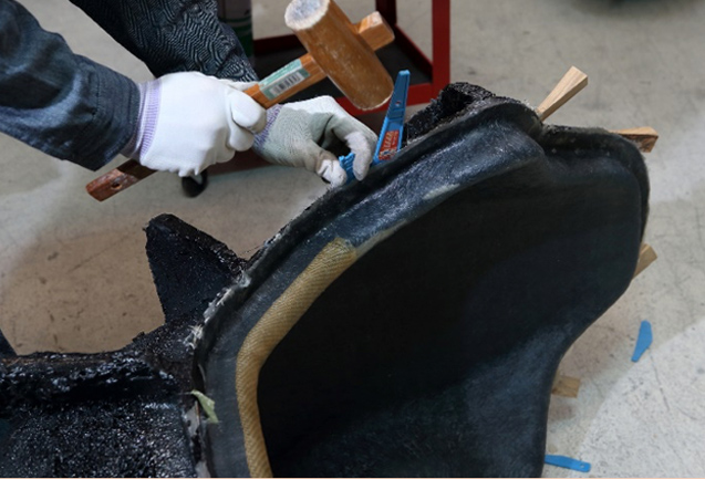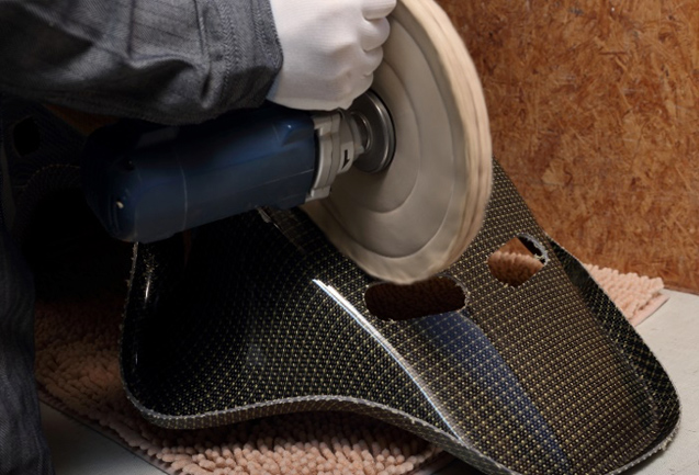 ブリッドではシェルをハンドメイドで製造しています。アラミド繊維への樹脂・硬化剤の塗布や、硬化したシェルの脱型、バリをとる削り、仕上げの磨きまですべて熟練のスタッフによる手作業で行います。多彩なバリエーションをもつブリッドのシートは、それぞれのシェル形状の細部の違いや、ホールド性を高めるために設計されたこだわりの形状にはハンドメイドによるきめ細やかな作業が必要になります。また、フルバケットシートの破断強度を格段に上げるためにアラミド繊維は部分裁断せず、シェル全体を一枚物で一体成形で仕上げています。ハンドメイドであるからこそ形状が複雑なシートシェルであっても、繊維素材を隅々までシートシェルの型に合わせこむことができ、高いホールド性を実現する製品が製造できるのです。