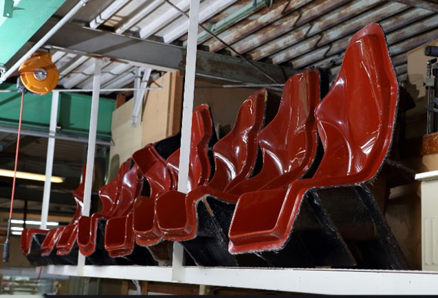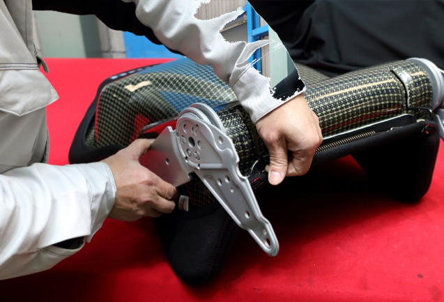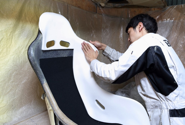 シェル、シートカバー、ウレタンクッションなどの各パーツは最終的にアセンブル用の工場で組み立てられ、スポーツシートとして完成します。フルバケットシートの場合はシェルにベースのウレタンクッションを貼り付けシートカバーを装着した後、座面や腿部に専用のクッションを装着し完成します。リクライニングシートはバックレストにリクライニング機構を取り付けた後に座面と接合し完成します。すべて熟練した社員が丁寧に組み上げていきます。完成品は検品チェックを受けた後、保安基準適合のシール貼付と証明書、それに加えFIA公認モデルの場合はFIA公認モデルの証明ステッカーを貼付して出荷されます。