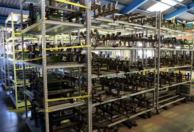 工場に保管される多くの治具が多くの車種に適合してきたノウハウを証明しています。