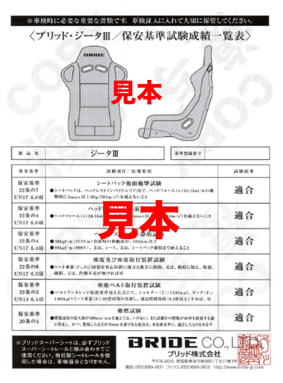 ブリッドのシートは、保安基準に則った試験を行い、車検対応モデルは、その試験成績の書類を全国の運輸局、運輸支局に提出しています。